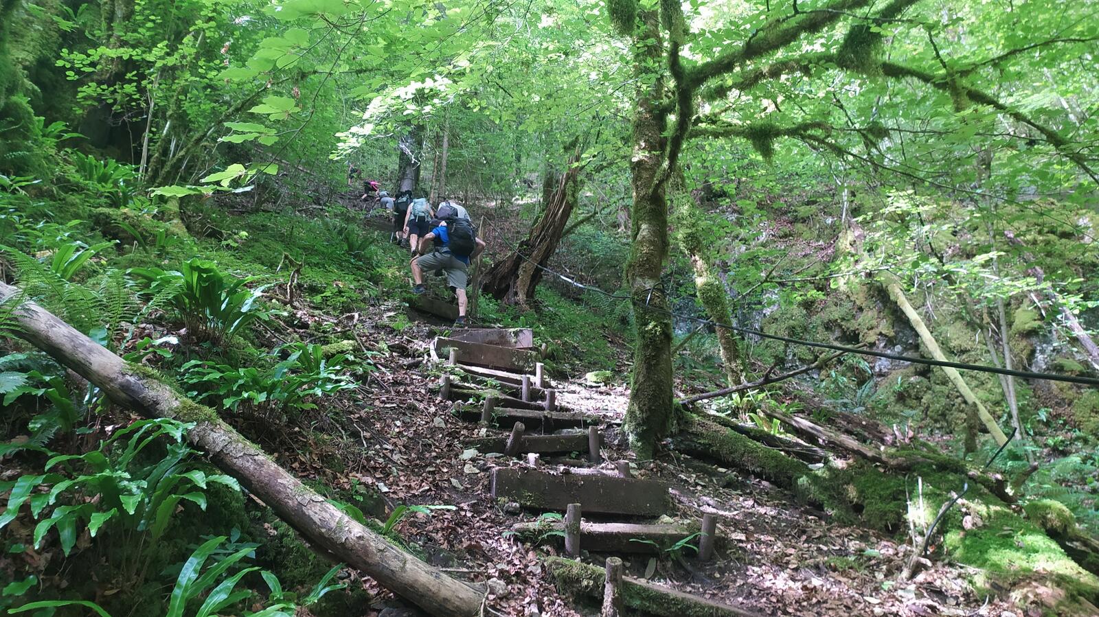 Départ alignés par 2, bien disciplinés mais cela n'a pas duré ! Découverte des cascades du Hérisson de bon matin sans touriste. Quelques escaliers à monter et descendre. Poursuite par le pic de l’Aigle sur sentier raide, boueux et très glissant. Pas de chute à ce moment-là, mais à la fin de la rando.